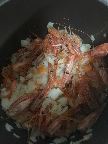 刻んだニンジン、玉ねぎ、エビの殻を加えて炒める